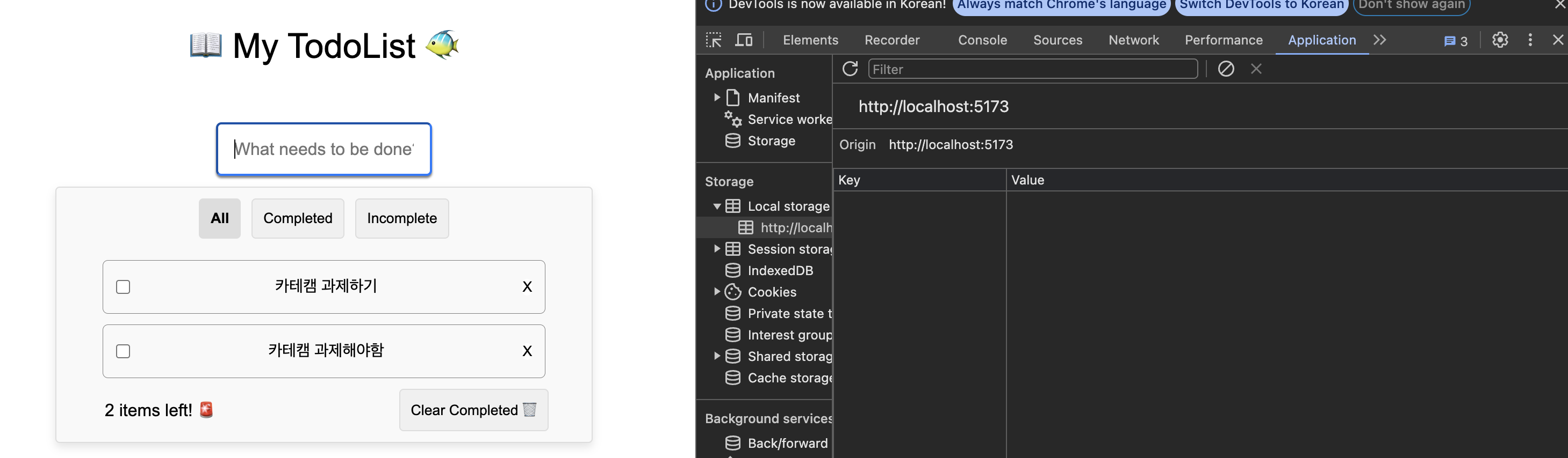 아래 사진을 보면 브라우저 local storage 영역에 데이터가 잘 저장된 모습을 확인할 수 있다.