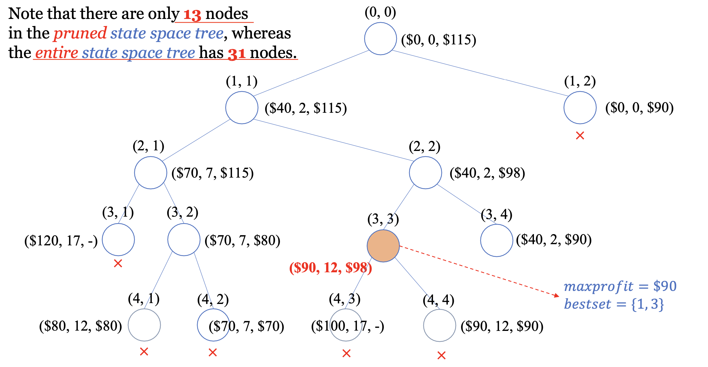 | (4,3) | 100 | 17 | - | - | - | 90 | (wi >= W) no -> (3,3)로 backtracking |