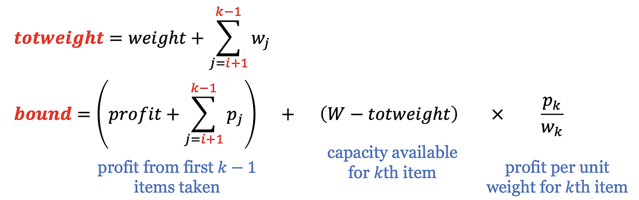 BFS로 knapsack 문제를 푸는 것은 DFS로 풀 때와 동일하다. 요약하자면, weight와 profit은 그 마디에 오기까지 포함된 아이템의 총 무게와 총 이익이다. 또 promising한지 판단하기 위해서 totweight, bound를 weight와 profit으로 초기화하고 totweight가 W를 초과하는 아이템에 도달할 때까지 Greedy하게 돌아간다. 이때 bound는 그 마디에서 얻을 수 있는 최대 이익을 말한다. maxprofit이 현재까지 찾은 최적 값일 때, bound가 maxprofit보다 작거나 같으면 non-promising으로 판단한다. 따라서 아래와 같은 식을 사용할 수 있다.