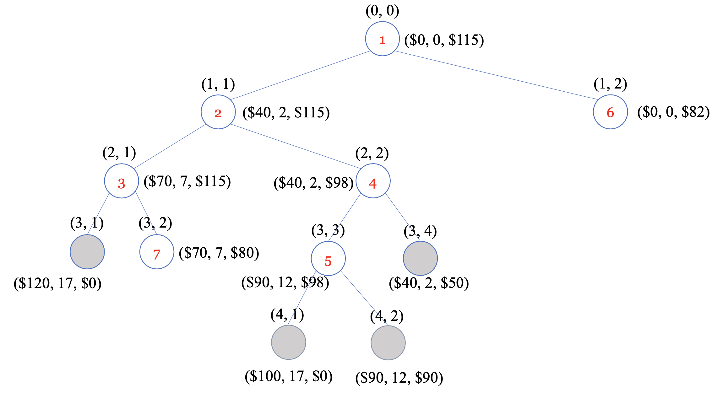 트리를 방문할 때 위와 같은 순서로 방문하게 된다. 이러한 방법을 0-1 knapsack problem에 적용해보자.