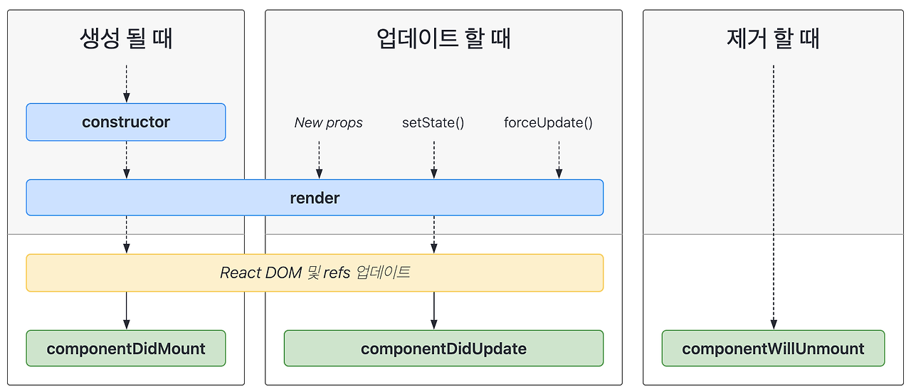 컴포넌트가 업데이트될 때 실행되는 함수이다. 컴포넌트가 업데이트될 때는 props 혹은 state 값이 변경되거나 부모 컴포넌트가 리렌더링 될 때, this.forceUpdate로 강제로 리렌더링되는 경우가 있다. 이때 호출되는 함수는 다음과 같다.