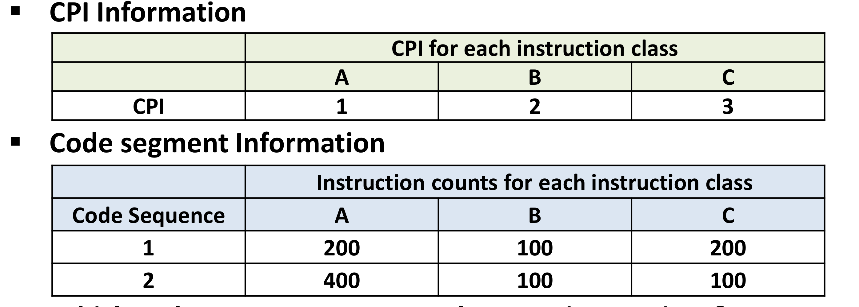 위 표를 통해서 프로그램1과 2의 총 명령어 개수를 구해보면, 1번 = 200 + 100 + 200 = 500, 2번 = 400 + 100 + 100 = 600이다. 어떤 프로그램이 더 빠를까? CPI를 각각 계산해보면 1은 (200*1 + 100*2 + 200*3) / 500 = 2.0 CPI, 2는 (400*1 + 100*2 + 100*3) / 600 = 1.5 CPI이다.