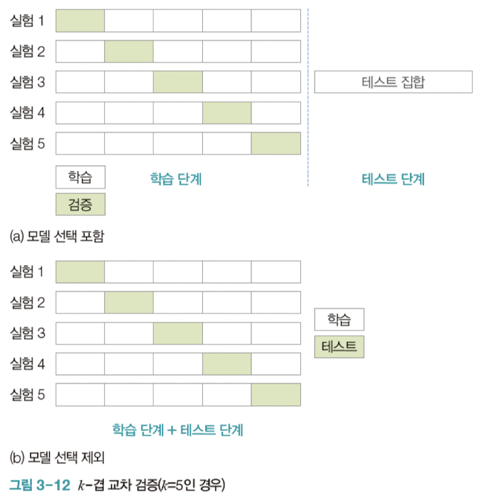 앞서 말했듯이, 전체 데이터셋을 모델을 학습하는데 사용하지 않고 훈련 집합과 테스트 집합을 나눠서 사용한다. 훈련 집합과 테스트 집합은 서로의 존재를 아예 알지 못하지만, 정말 운좋게 테스트의 정확도가 100이 나오거나 0이 나올 수 있다. 이를 방지 하기 위해서 훈련 집합을 k개의 부분집합으로 나누어 사용한다. 이를 k-fold cross validation이라고 한다. 한 부분집합만을 남겨두고 k-1개의 부분집합으로 모델을 학습한 다음, 남은 한 집합만으로 테스트를 진행해 성능을 측정한다.