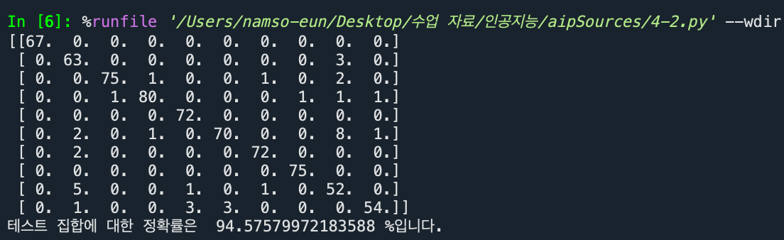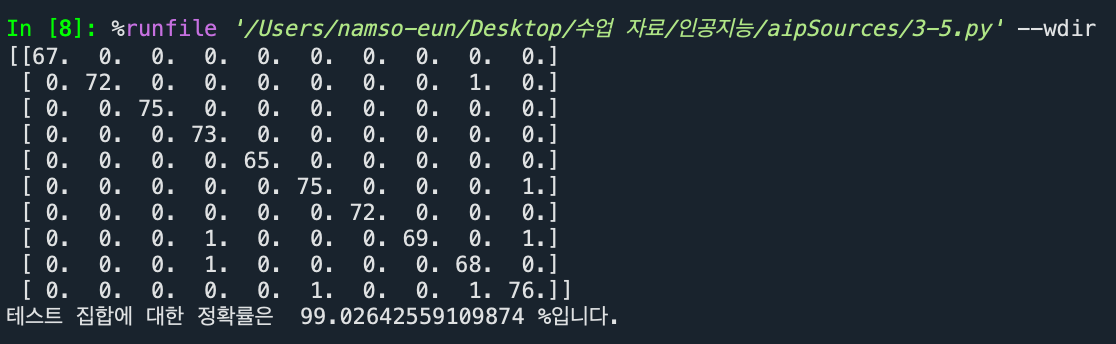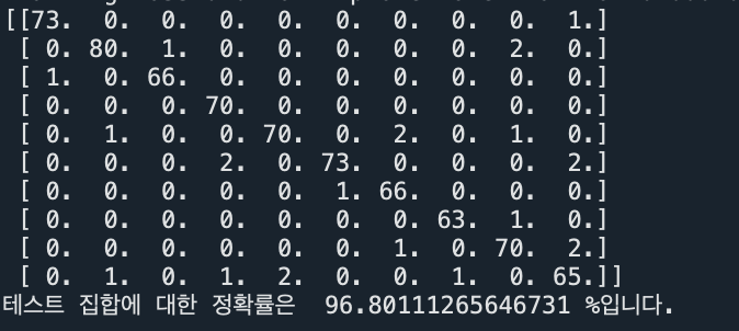 print("테스트 집합에 대한 정확률은 ", accuracy * 100, "%입니다.")