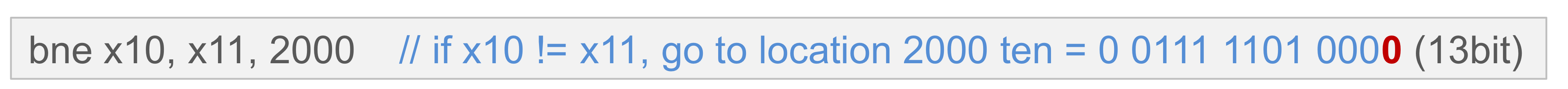 아래 예시를 보면, immediate에 1bit가 추가된 것을 확인할 수 있다. bne x10, x11, 2000이라 하면 2000 * 2bytes로 계산하는 것이다. 2000 * 4bytes 해야하는 것 아닌가?라고 생각할 수 있다. RISC-V에서는 2 byte instruction을 설계하고 싶었기 때문에, 2의 배수를 2진수로 표현했을 때, 마지막에 항상 0이 오기 때문에 이런식으로 표현한 것이다.