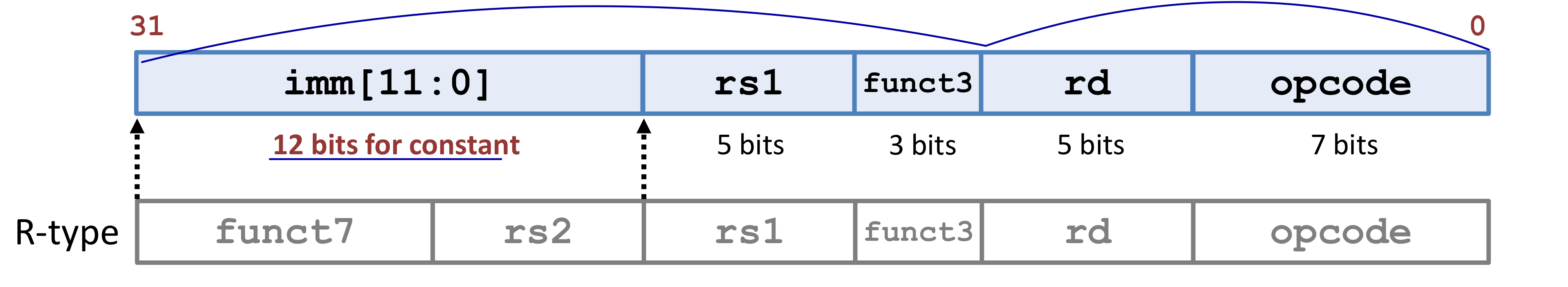12비트 immediate에 상수를 표현한다. 이때, sign-extended이므로 -2048에서 +2047까지 표현할 수 있다. 예를 들어서, addi x15, x1, -50은 아래처럼 표현할 수 있다. sign-extended 된 Immediate에 주목해서 확인해야 한다.