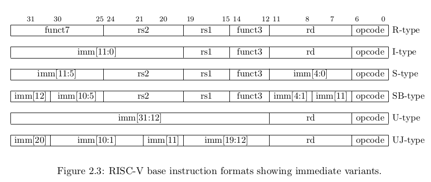 사람이 내린 명령어는 컴퓨터 내부에서 숫자의 연속으로 저장된다. 숫자들이 모여 명령어로 해석되며 RISC-V에서는 32bit 고정된 명령어 길이를 갖는다. 명령어 길이를 모두 동일하게 고정하고, 명령어 종류에 따라 형식은 다르게 설정하였다. 대략 6개 타입으로 분류할 수 있다.