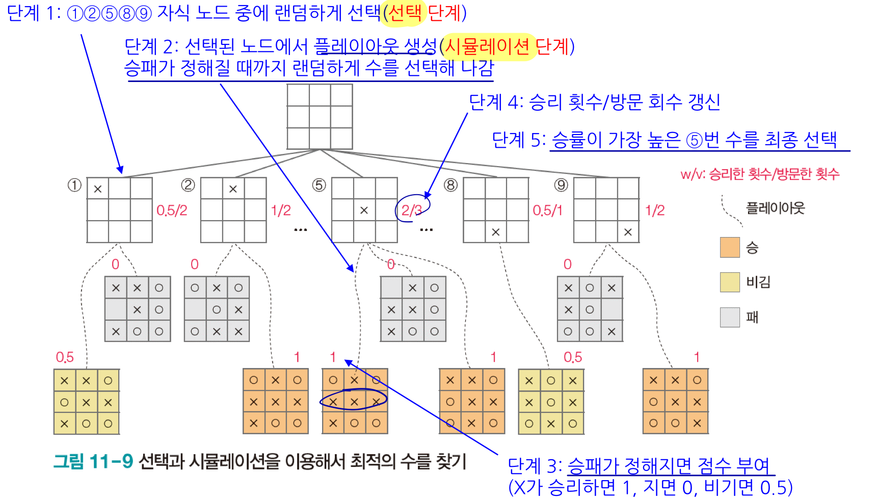 - 시뮬레이션 : 노드 c에서 시작해서 게임이 종료될 때까지 진행해 플레이아웃을 하나 만들고 누가 승리했는지 판정한다.