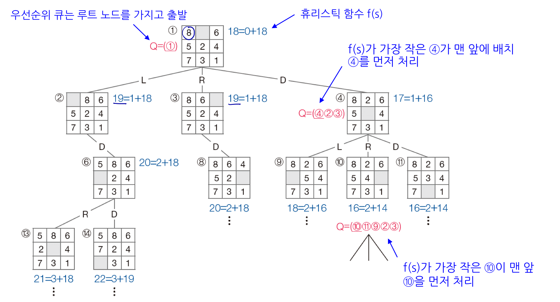 아래 그림처럼 각 노드의 값을 f(s)를 계산하고 우선순위 큐에 넣어 탐색할 노드를 판단한다. 즉, 현재 보고 있는 노드보다 다른 노드의 f(s)가 더 작은 경우 해당 노드로 이동해서 먼저 탐색한다. 이동 횟수를 줄이는데 최적이다.
