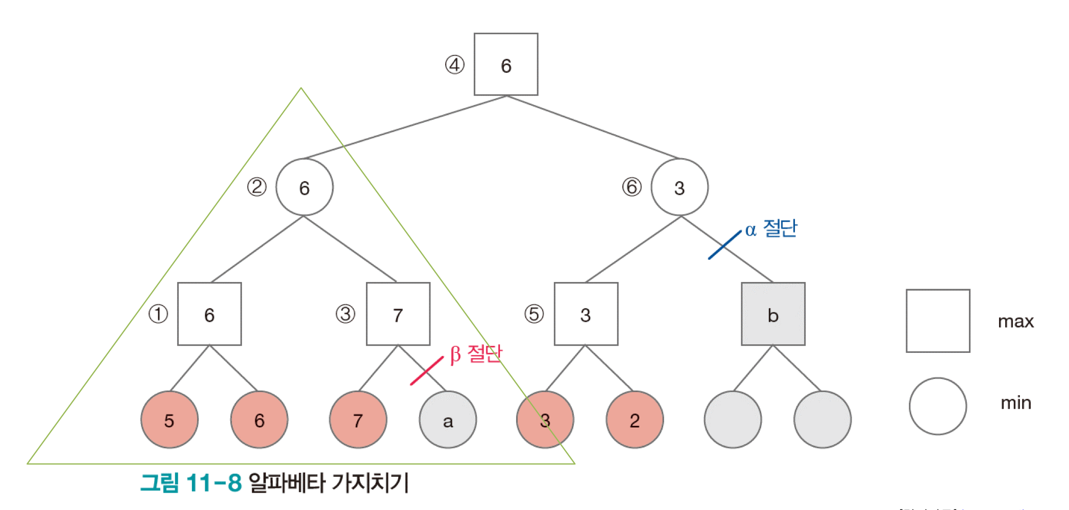 두번째는 알파베타 가지치기 방법이다. 깊이 우선 탐색을 수행하면서 max 혹은 min에서 가지치기를 한다. 아래 그림을 참고해보면, 네모가 자식 노드의 max 값, 동그라미가 자식 노드의 min 값을 취한다고 하자. 2번에서 보면 자식 노드의 min 값을 취해야 하기 때문에 둘 중 작은 값을 선택한다. 이때, 3번은 자식 노드의 max 값을 취하기 때문에 a는 무조건 7보다 작다. 이때, 1번에서 6이 7보다 더 작기 때문에 a를 보지 않아도 2번 값이 결정된다. 그래서 이때 가지치기를 수행한다. 오른쪽 자식노드로 넘어가서, 6번은 min 값을 취한다. 5번까지 계산이 완료된 상태에서 b가 5번 노드 값보다 크게 되면 선택하지 않고, b가 5번 노드보다 작게 되면 선택하지만 4번에서 max 값을 취하기 때문에 선택하지 않는다. 그래서 가치지기를 수행한다.
