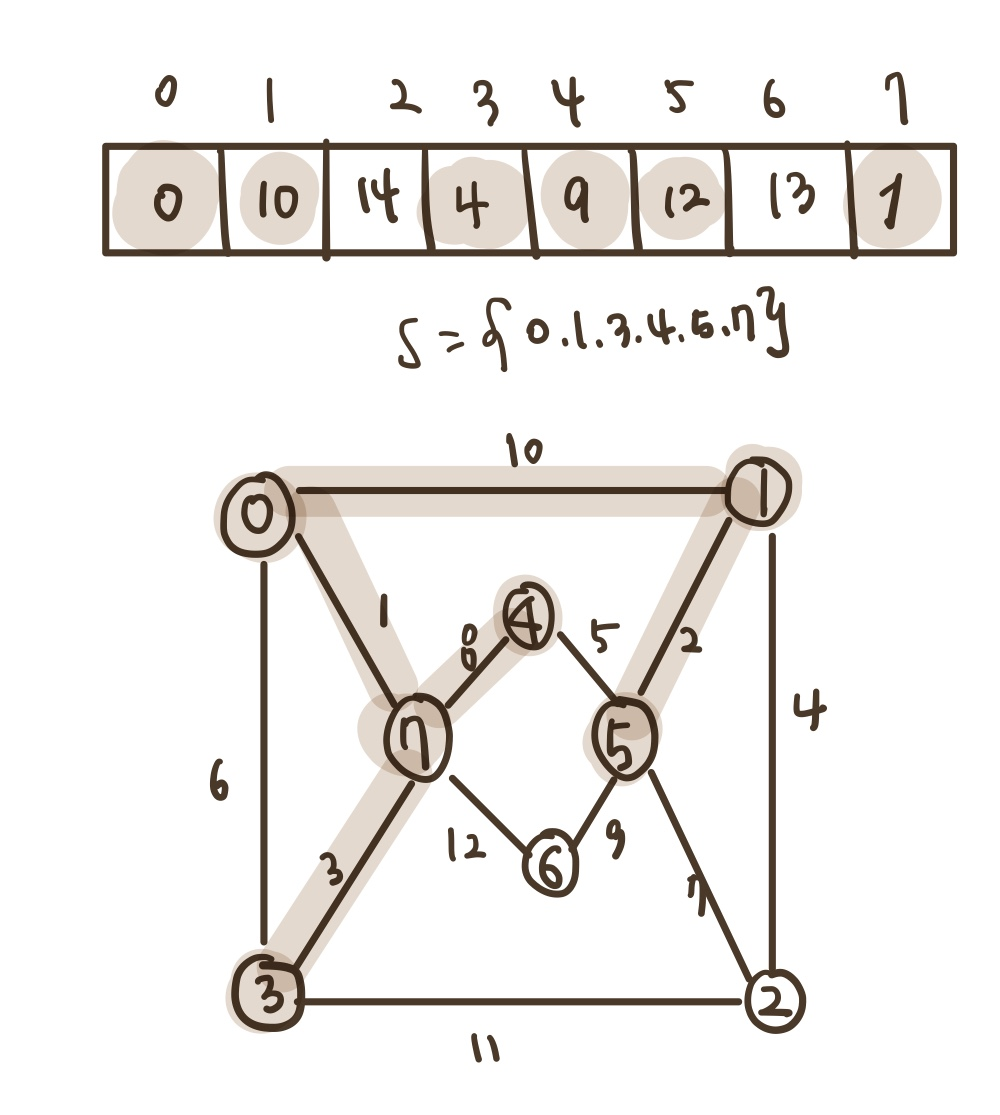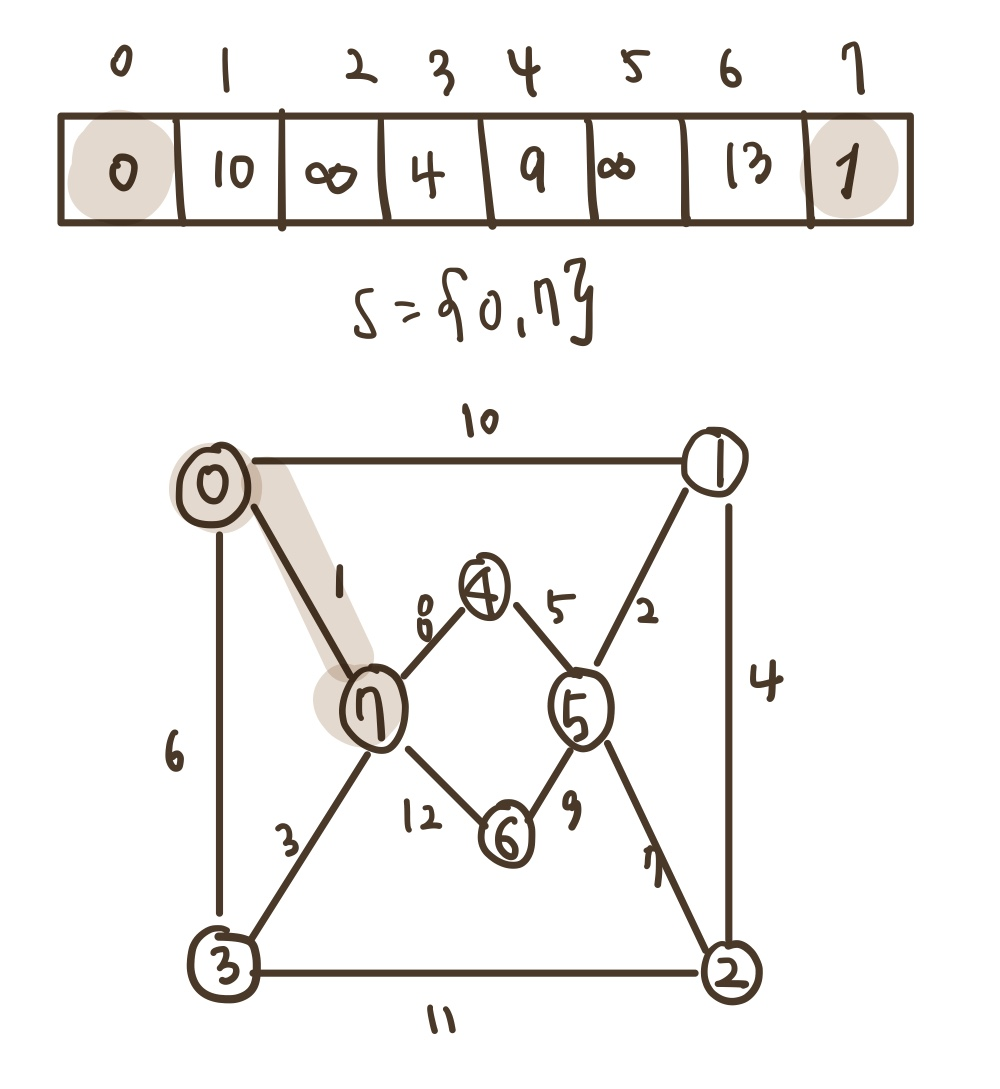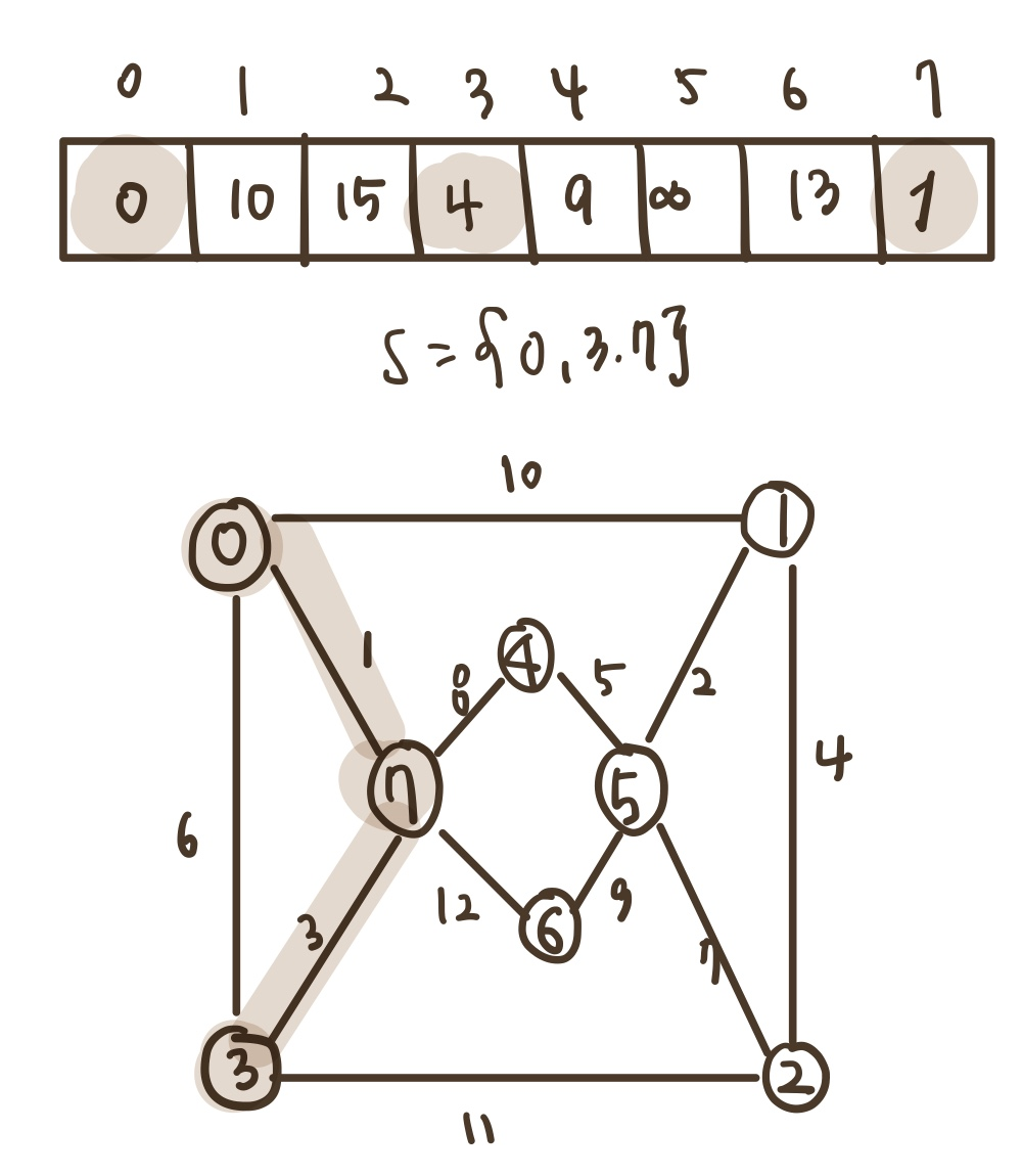 - 집합 S : 최단 경로가 이미 발견된 정점들의 집합