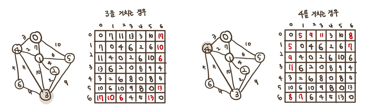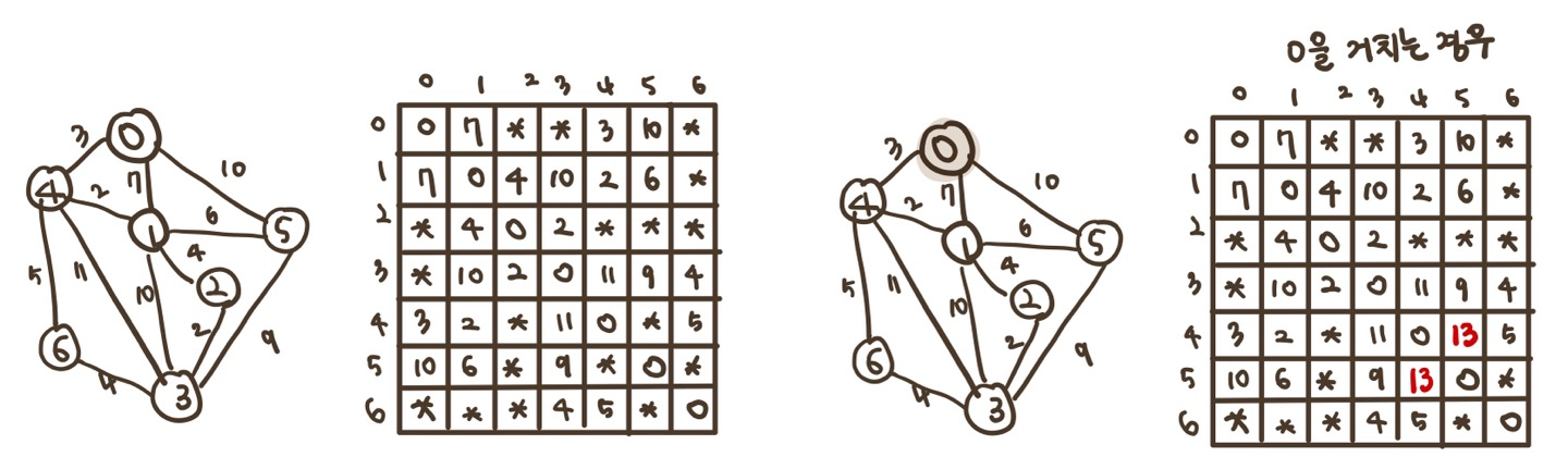 1) 그래프의 가중치 행렬로 배열을 초기화 한다. 0~6을 거치는 경우를 파악한다.