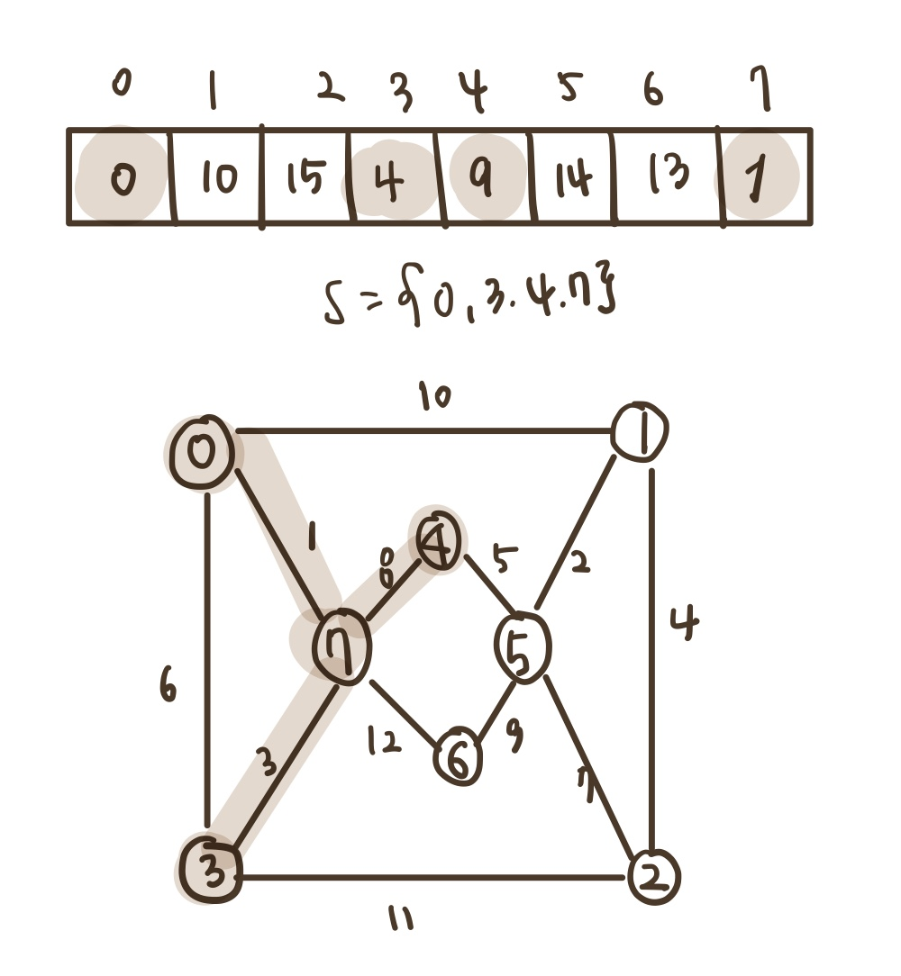 - 1차원 배열 distance : 집합 S에 있는 정점만을 거쳐서 다른 정점으로 가는 최단 거리를 저장하는 배열, 해당 정점 간의 가중치가 저장